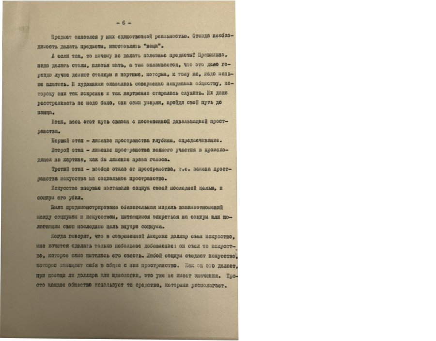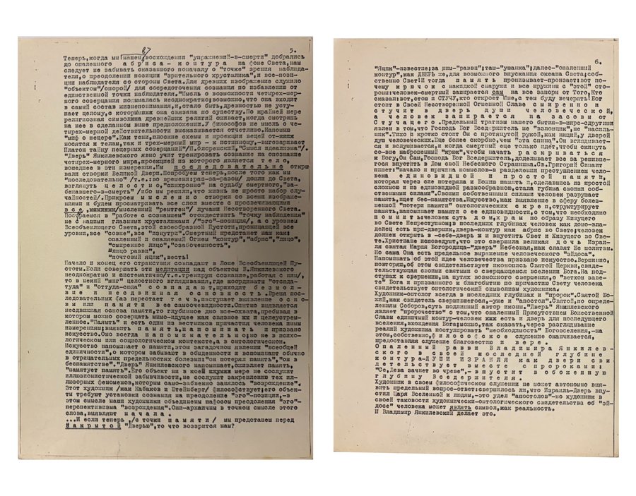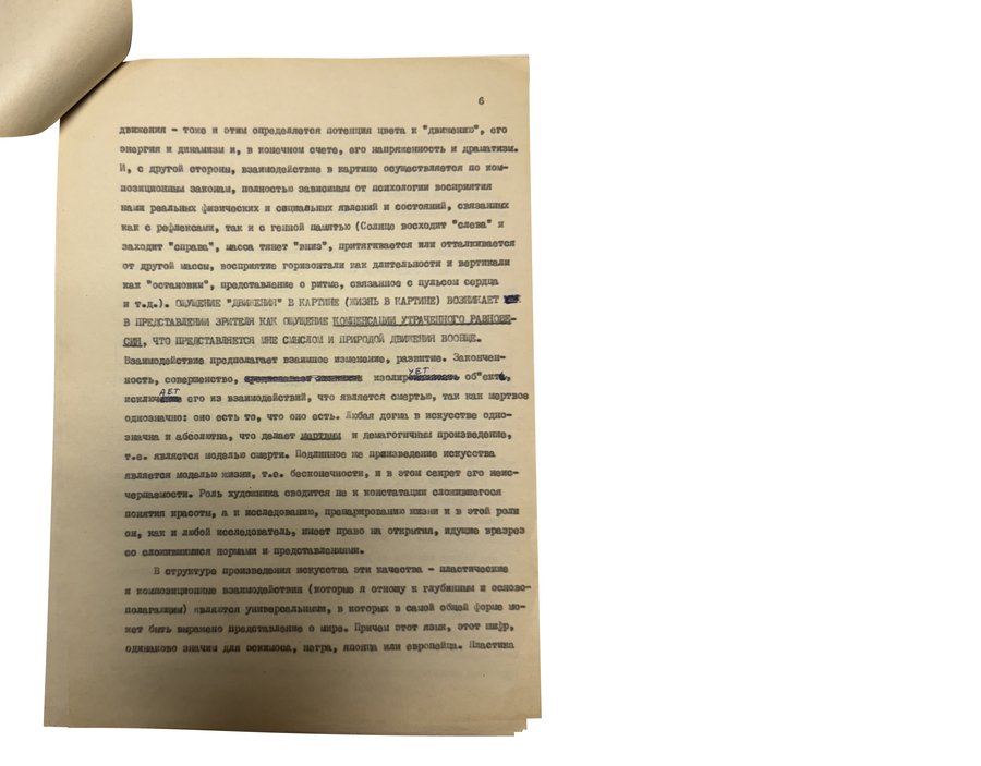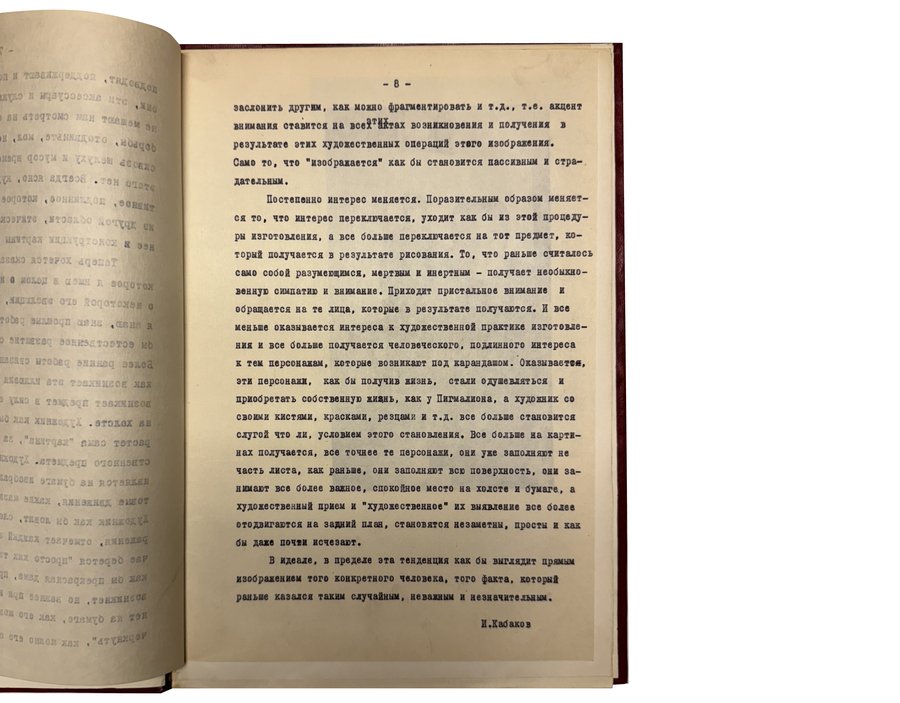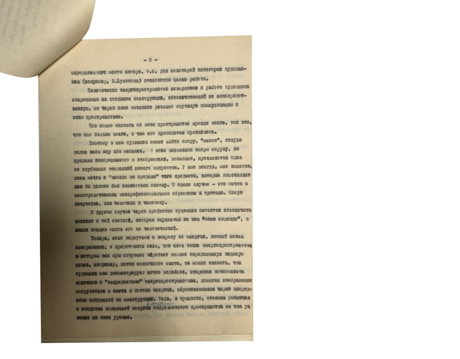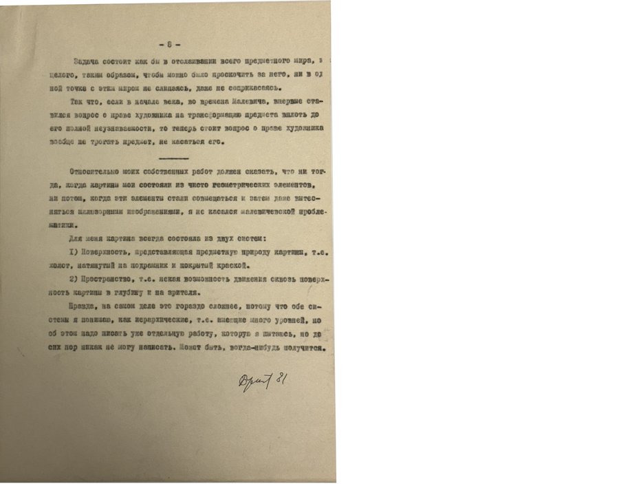 Текст Э. Булатова с авторской подписью «Об отношении Малевича к пространству». 1981. Машинопись. 8 листов. 29,8×21 см
