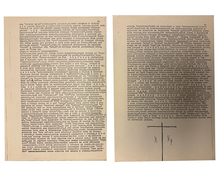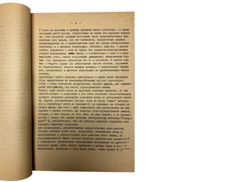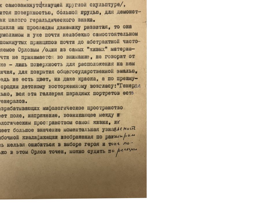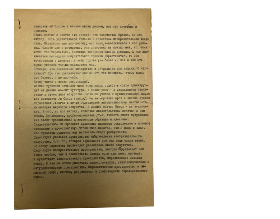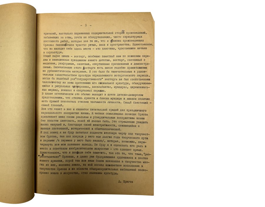 Текст Дмитрия Пригова о Борисе Орлове. На 3-х листах, скрепленных скобами. 29,8×21 см