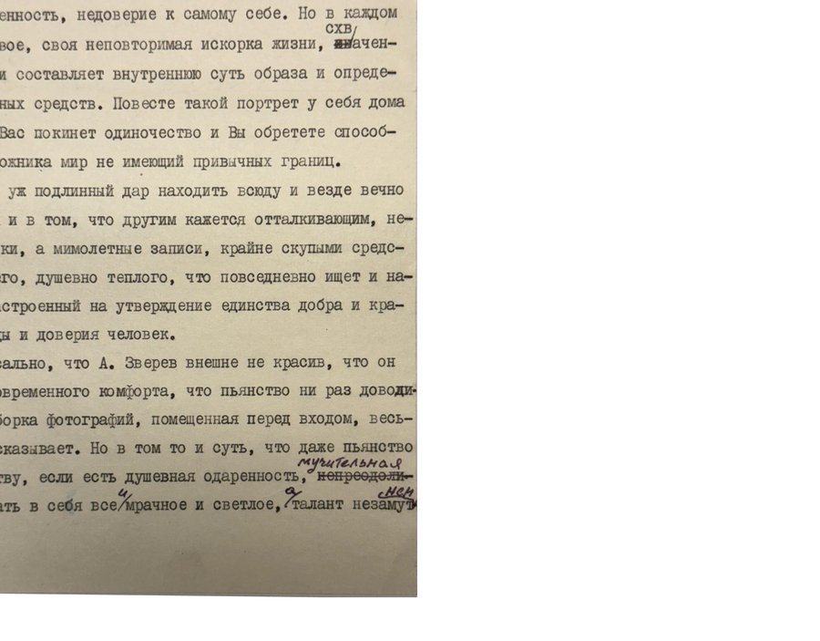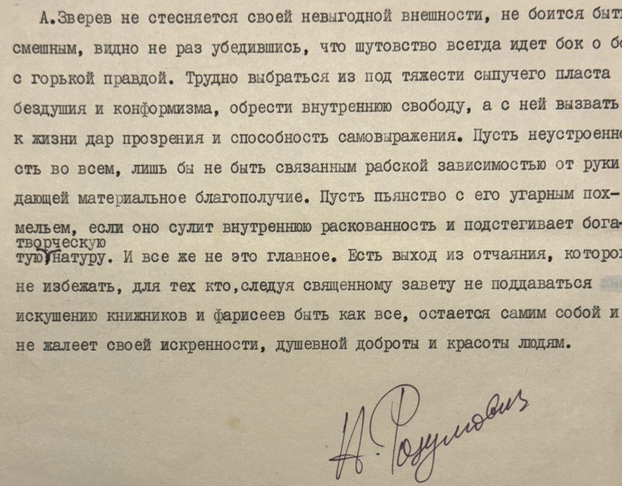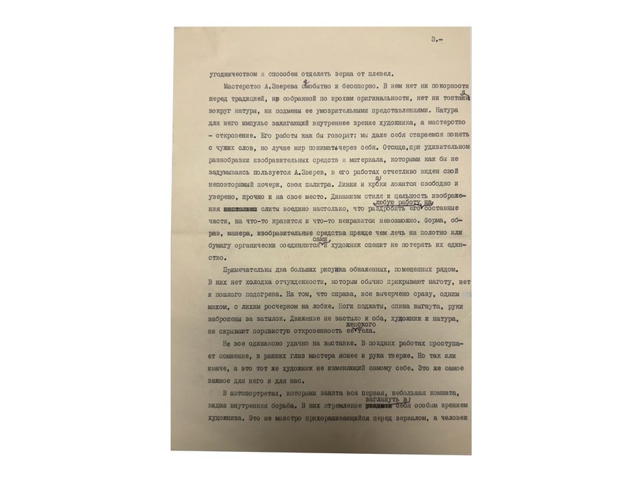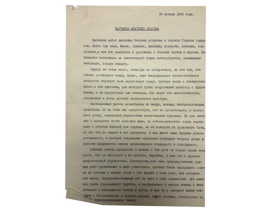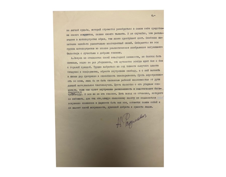 А. Разумович о выставке Анатолия Зверева 30 января 1984 года. Машинопись. 4 листа. 29,8×21 см. Авторская подпись в нижней части 4 листа.
