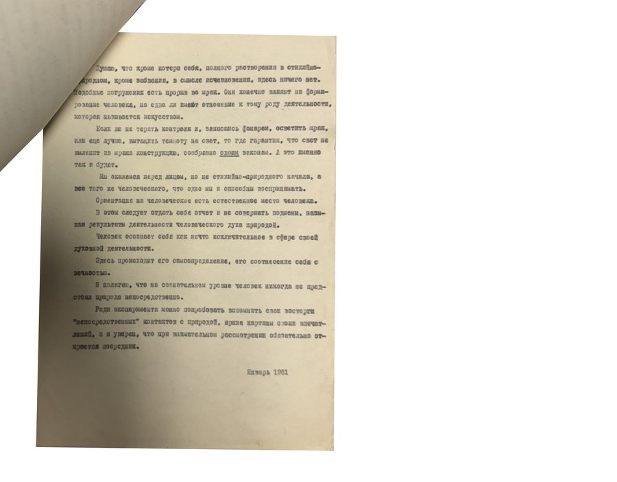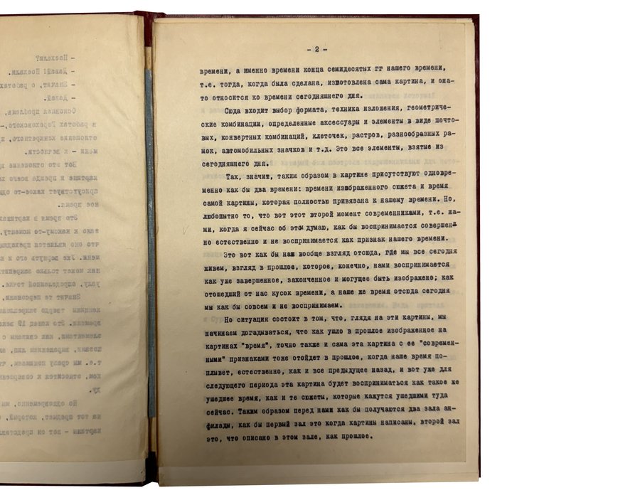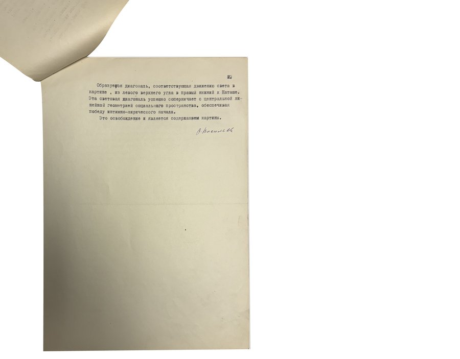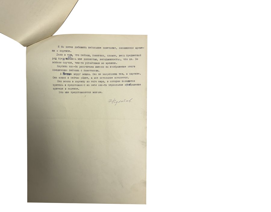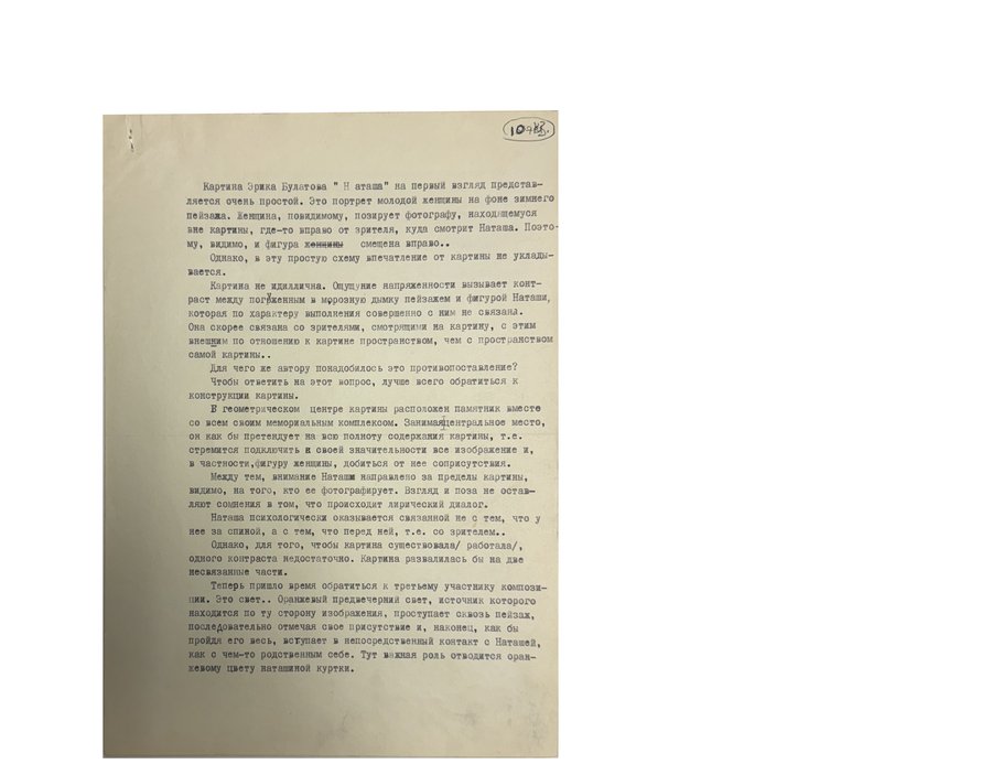 Олег Васильев. О картине Эрика Булатова «Наташа». Машинопись (10 экземпляров). 2 страницы (подписано Васильевым) 29,8×21 см + 1 страница с комментарием Э. Булатова (подписано Э. Булатовым) 29,8×21 см