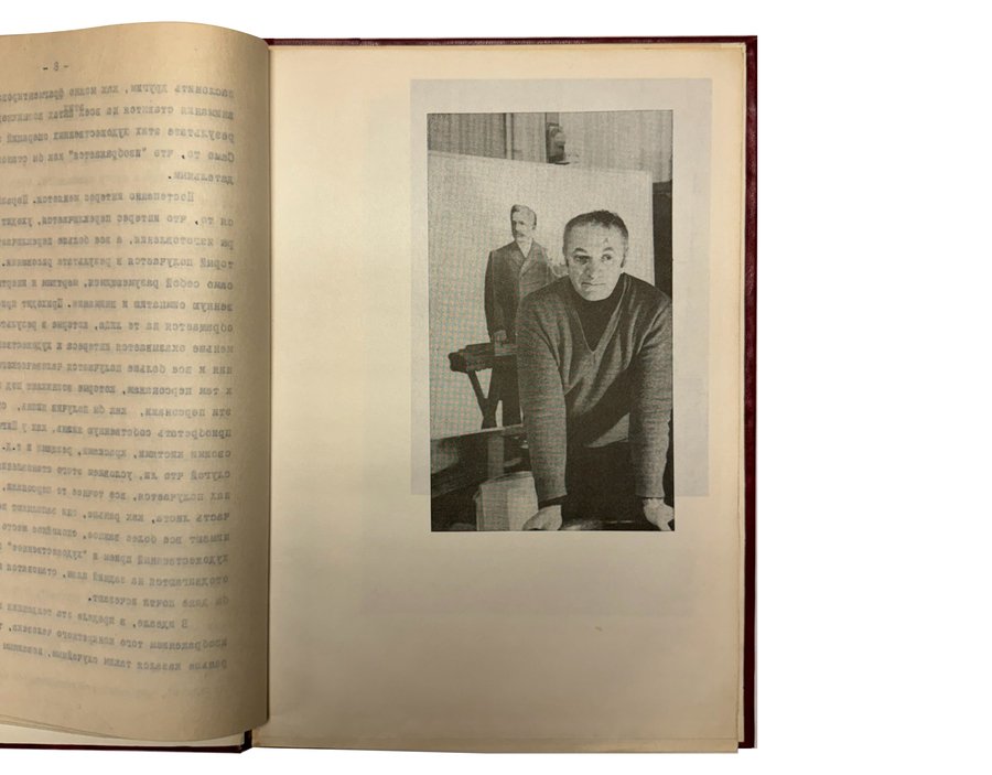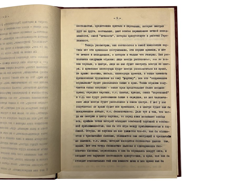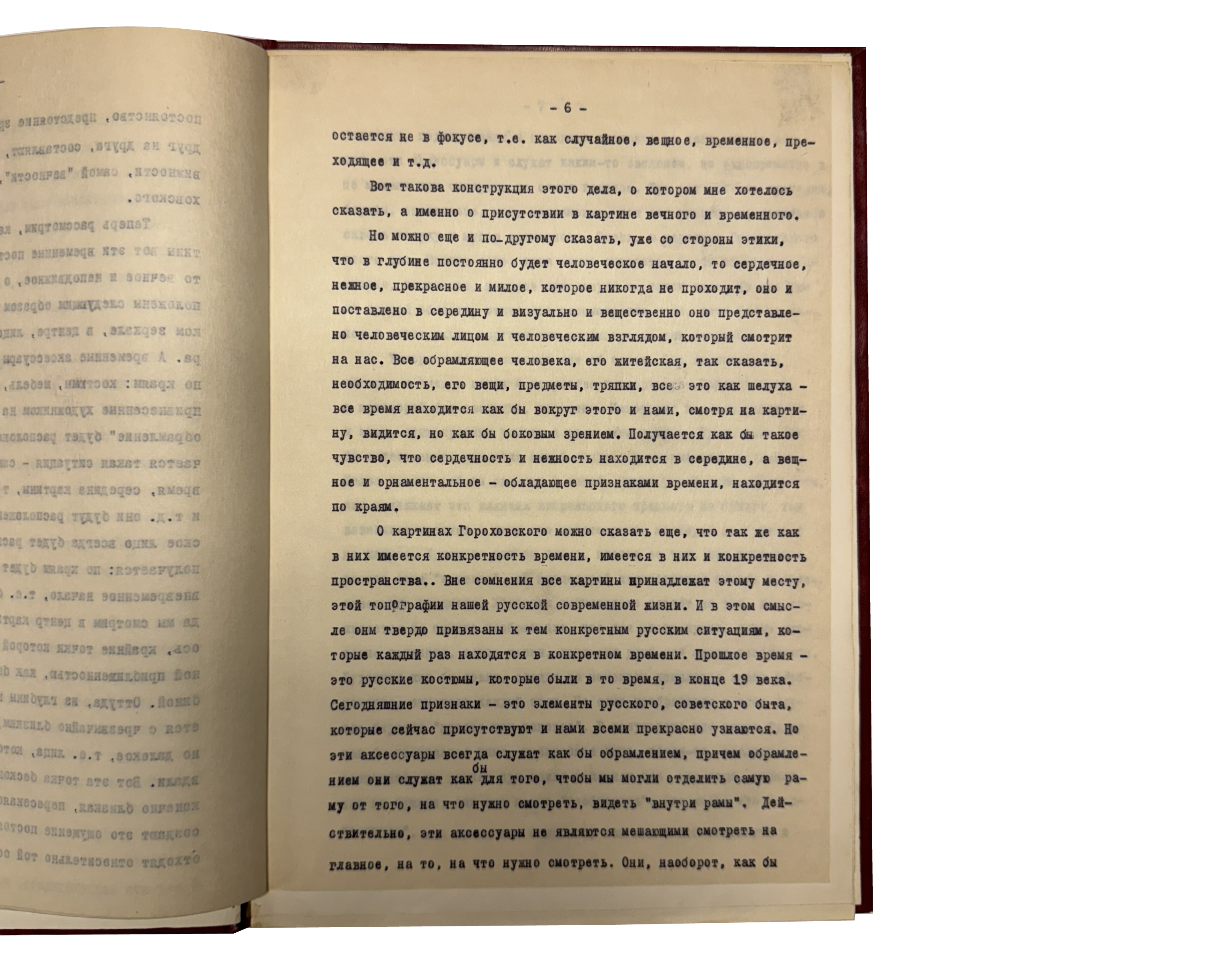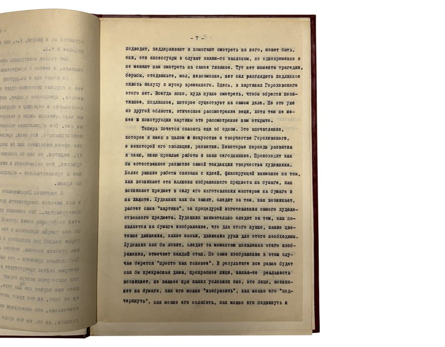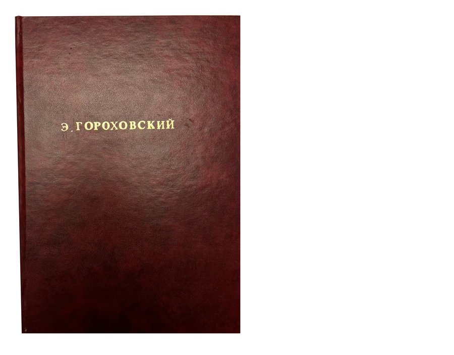 9 из 15 подписных экземпляров, согласно надписи Э. Гороховского (синей шариковой ручкой) на 1 листе. Тексты (2 статьи) и ксерокопии фотографий произведений в жесткой темно-красной обложке (альбома) с золотым тиснением: Э.ГОРОХОВСКИЙ.