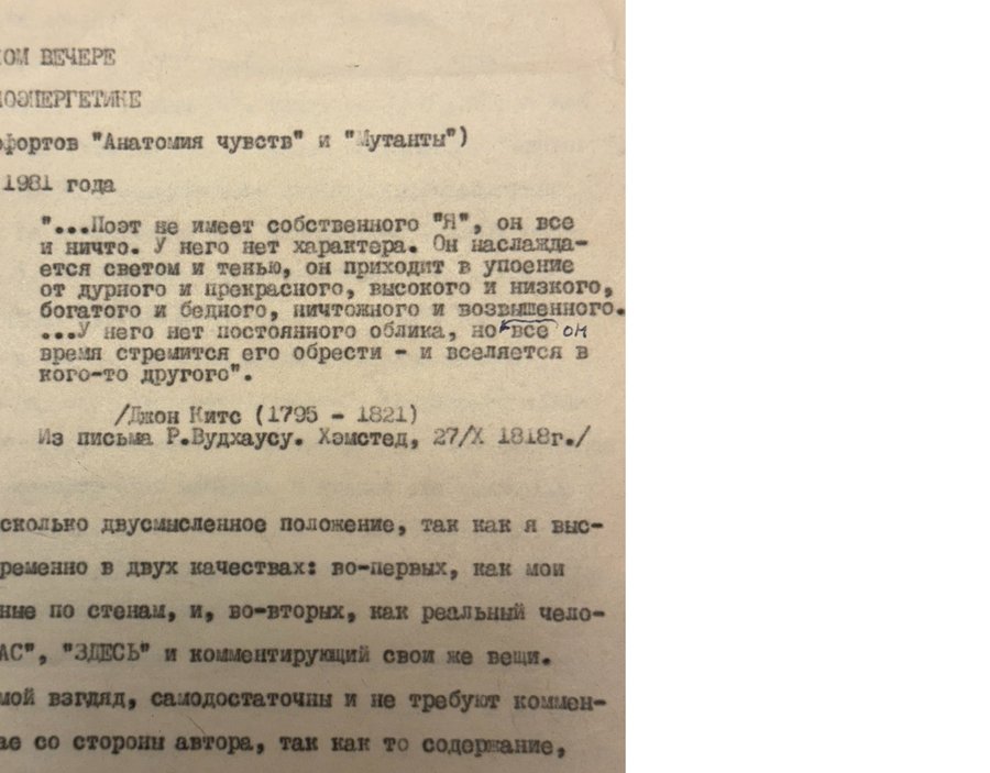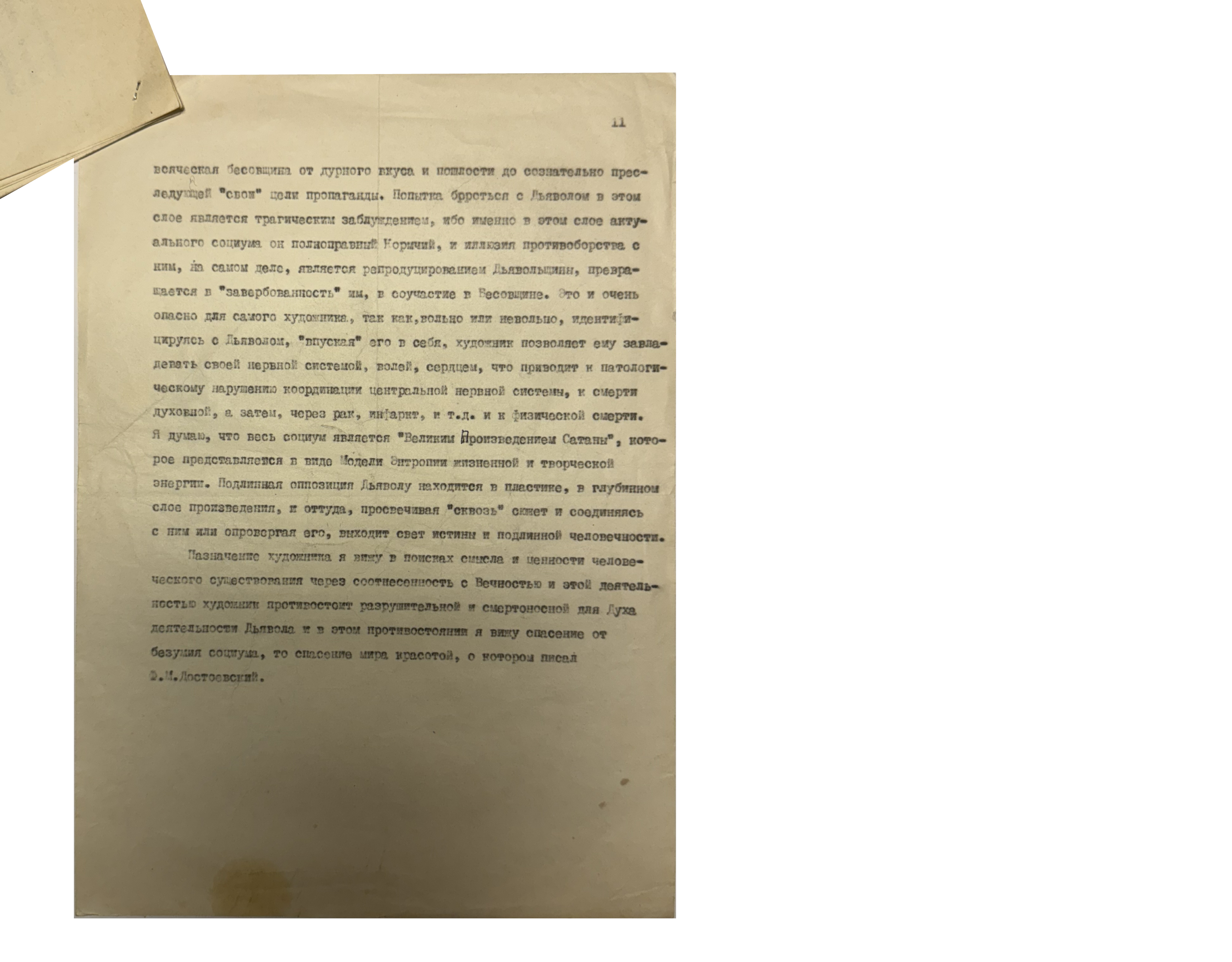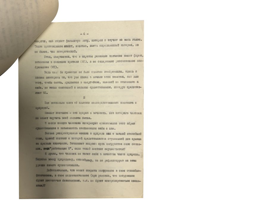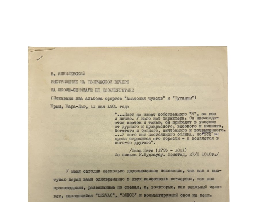 Текст В. Янкилевского «Выступление на творческом вечере по биоэнергетике». Крым, Кара-Даг, 11 мая 1981 года. На 11 листах, скрепленных скобой. 29,8×21 см