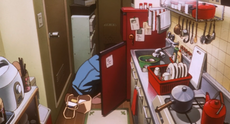 После возвращения домой, героиня замечает, что рыбки в ее аквариуме оказываются мертвыми. Квартира становится метафорой внутреннего мира Мимы Киригоэ. Сатоси Кон перестраивает объективную реальность под своё состояние. Снятие плаката бывшей поп-группы, постоянно закрытые шторы, появление компьютера, как средство расширения и так замкнутого пространства.