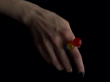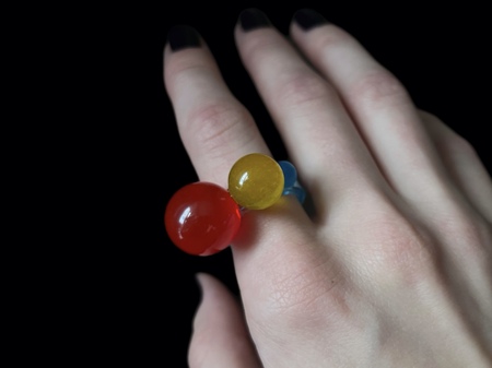 prompt: jewelry ring in the shape of yo-yo, minimalism, main colors: light green, orange