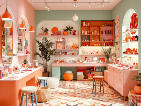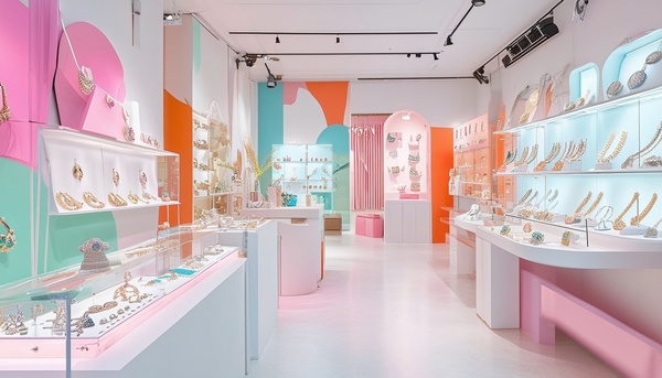 prompt: the white room of the brand’s store of handmade jewelry and custom items, the interior in the Memphis style, many details in pink, light green, orange colors