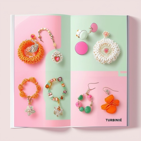 prompt: generate a catalog for the brand of handmade jewelry in the style of the 2000s called «TURBINIE», the main colors are pink, light green, orange, white