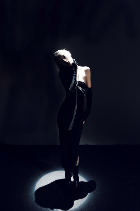 Мама на фотографии одна в верхней одежде, многие из остальных полуголые. Мама в закрытой позе и очень серьёзна, она выглядит грубой и немного угрожающей. Из её истории мы узнали, что она чувствует себя одинокой и обиженной, потому что папа в командировке и она одна без пары в этот вечер. Через некоторое время папа приехал сюрпризом к ней. Наверное мама тогда сняла свою кожаную куртку и пошла танцевать с папой и со всеми. Под курткой же был комбинезон с леопардовым принтом, а моя мама очень любит праздники и танцы. Куртка в этой ситуации является защитой/барьером, под которым моя мама скрывает эмоции. Хрупкое и нежное внутри скрывается под брутальной кожей. > сочетание разных контрастных фактур: кожезаменитель и сетка, металл и сетка; два образа: закрытый и открытый