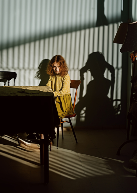 Серия фотографий посвящена неконтролируемому детскому страху, который чаще всего проявляется в тот момент, когда дети остаются одни дома. «Глаза» их страха растут, и обычные предметы начинают казаться все более угрожающими.