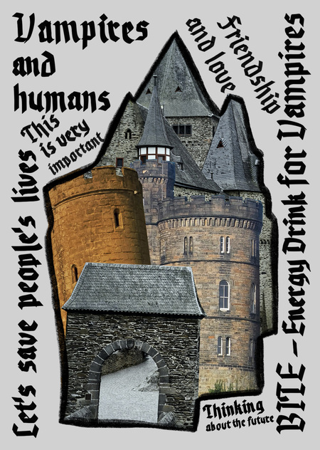 Плакаты для компании «BIte», изготовителя энергетических напитков для вампиров. Цель компании изменить отношение вампиров к людям. Многие современные вампиры хотят отказаться от человеческой крови и жить свободно: заниматься спортом, путешествовать, устраивать вечеринки, общатьсяс людьми. Лекции и фестивали призваны наладить отношения между людьми и вампирами.