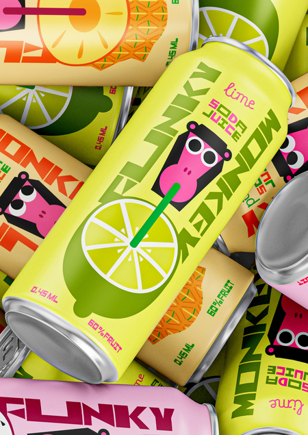 Funky Monkey is a youth soda with fresh juice added. Rebranding of the traditional beverage package. The design is inspired by the work of a futuristic artist, Fortunato Depero. The Funky Monkey logo has been developed. The main character is a monkey drinking fruit that’s added to the soda. The color gamma is designed for a series of three tastes. Such a solution would create a colour stain on the shelf and attract the attention of the consumer.
