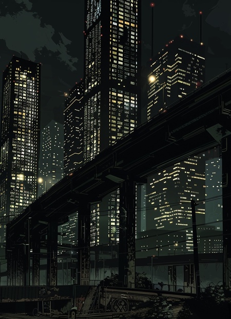 Promt: Tall skyscrapers at night, in front of which there is a high overpass, digital dirt distressed