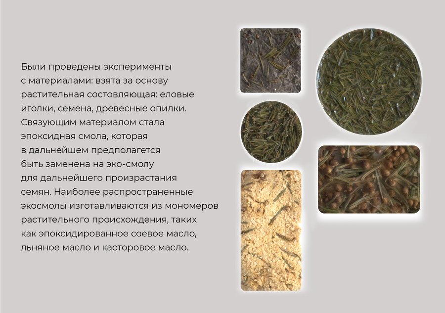 Идея, в которой объекты, пространственные решения и даже материалы могут изменяться и адаптироваться в зависимости от условий и потребностей. Объектом концепции является уличная мебель, созданная из модульных элементов. Этот проект не только отвечает требованиям удобства и функциональности, но также подразумевает использование природных материалов, перемены и взаимодействие с окружающей средой. Важным аспектом данного проекта модульной уличной мебели является ее способность преобразовывать городскую среду в природную. В дальнейшем эти элементы могут работать как органические удобрения и также внедренные семена будут прорастать в земле, способствуя росту растительности в городской среде.