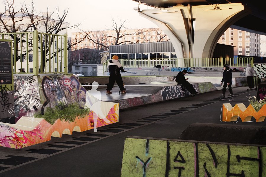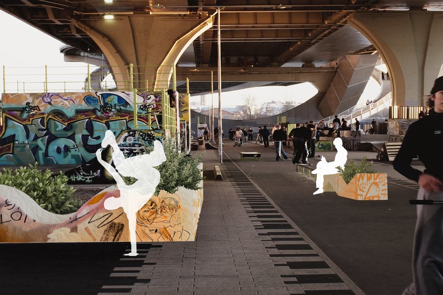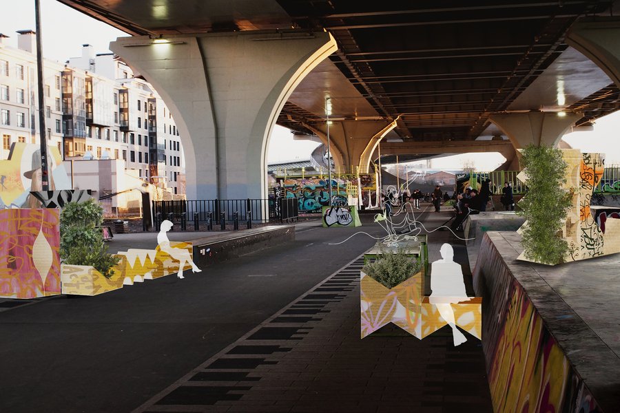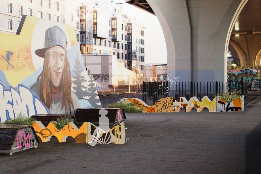 Локацией для проекта было выбрано пространство в г. Санкт-Петербург под мостом Бетанкура, где расположен скейт-парк. Здесь почти нет растительности, но много бетонных сооружений, песка, а это место окружают промышленная зона с автомастерскими и заводами, и крупная автомагистраль города. Данное место выбрано для того, чтобы показать, как в урбанизированную среду могут внедряться функциональные объекты, которые в процессе трансформируются в природные и создают живую и благоприятную среду.