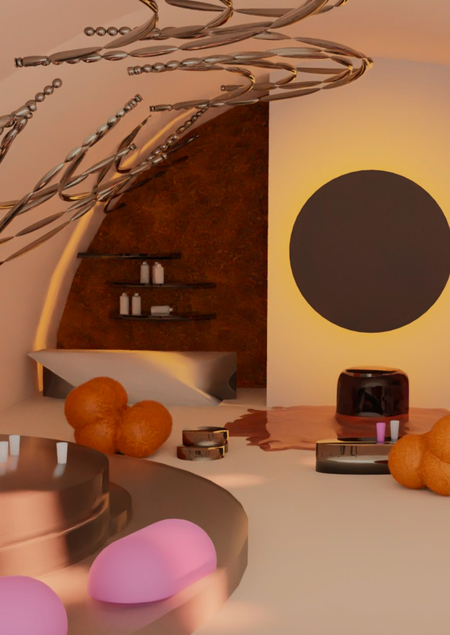 с фантазийным пространством будущего. Задача: создать пространство с привычными объектами вроде кресел, столиков, барной стойки, но превратить их
