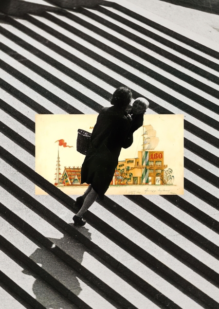 Точно так же, как и на выставке Родченко, здесь само пространство диктует маршрут зрителю. В центре выставочного зала находится доминанта — проектор транслирует документальные кадры сельскохозяйственной выставки. Работы расположены на одной линии и в одинаковых паспарту по стенам.