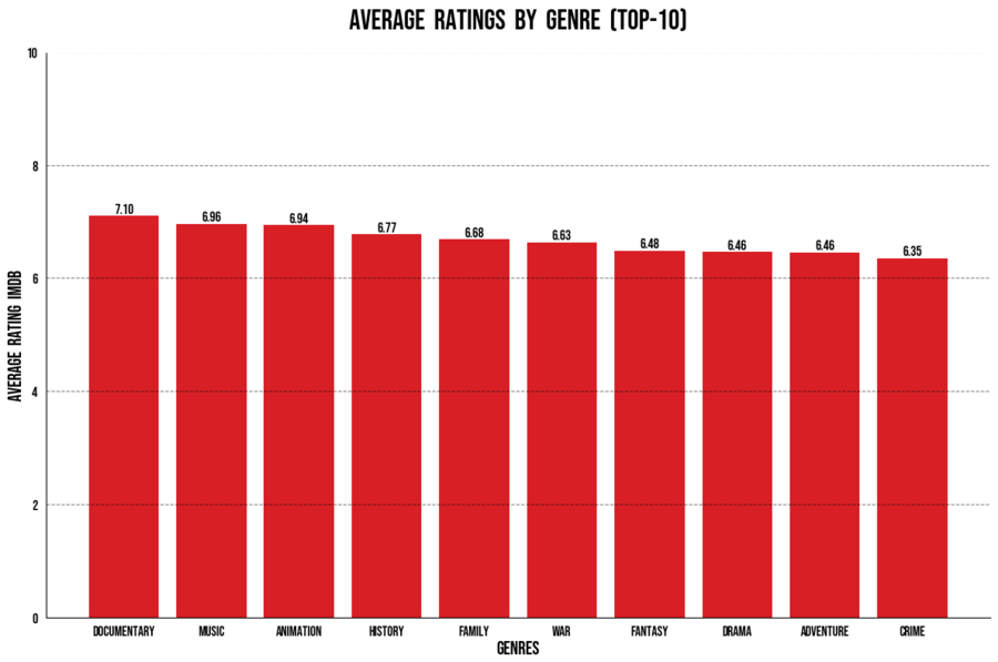 Дальше я выяснила, фильмы какого жанра в среднем получают самые высокие рейтинги на IMDb. Интересно, что самые высокие средние рейтинги у документалок, а самый низкий — в криминальном жанре.