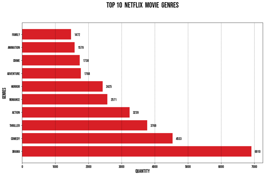 Сначала я решила определить самый популярный жанр в порядке возрастания. Первое место заняла драма, второе — комедия. Семейные фильмы, к сожалению, почему-то на последнем месте по популярности.
