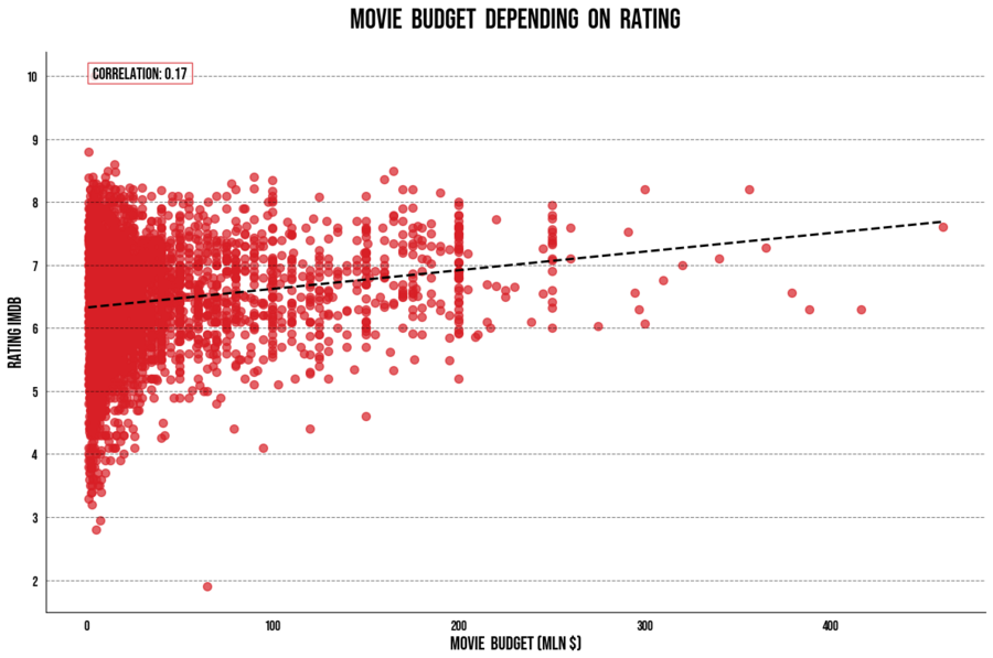 Мне также показалось интересным изучить связь между бюджетом и рейтингом фильма. Получилось проследить положительную корреляцию: чем выше бюджет фильма, тем (как правило) больше рейтинг этого фильма на IMDb. Однако, как можно увидеть по графику, и фильмы с низким бюджетом получают хорошие рейтинги: 7–8. Таким образом, далеко не всегда высокий бюджет гарантирует высокую оценку зрителей.
