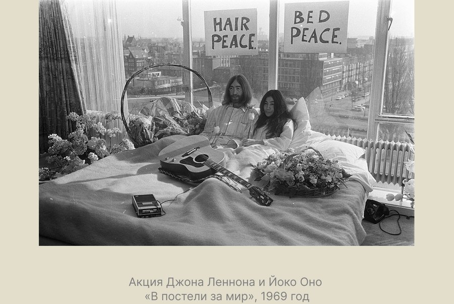 В США многие кумиры хиппи выступали с антивоенной позицией. Например, Джон Леннон и его жена Йоко Оно в 1969 году провели необычную акцию, пролежав две недели в кровати гостиничного номера, каждый день разговаривая с журналистами о важности мира.