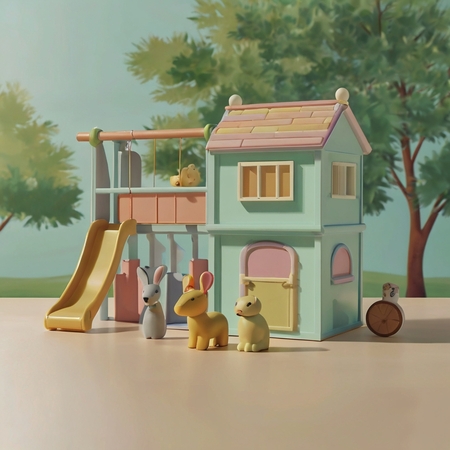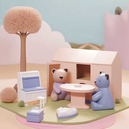 Игровые наборы. Промт сгенерирован с помощью ChatGPT: write a promt to generate a photo of a play set with dollhouse and cute animal figures in pastel colors