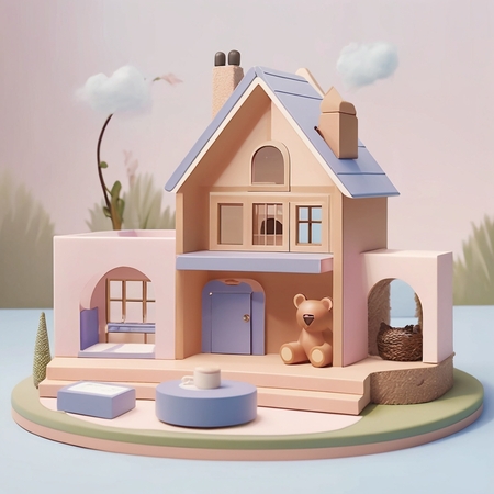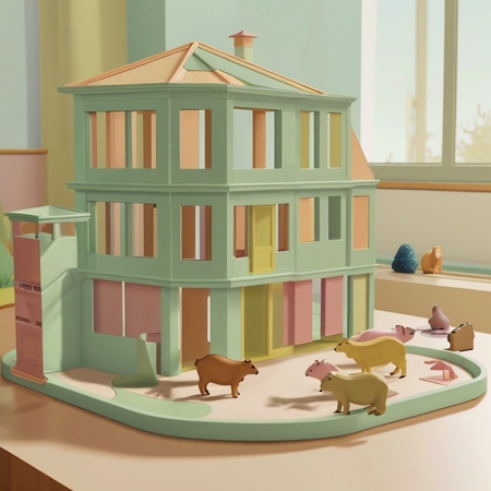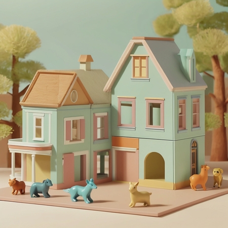 Сгенерировано в Leonardo с использованием в качестве референса изображения из оригинального проекта. Promt: create a charming scene featuring a pastel-colored play set with a miniature dollhouse and an assortment of cute animal figures. The dollhouse should be small, detailed, and painted in soft shades of pink, lavender, and light blue, with tiny windows, doors, and a cozy interior. Surrounding the dollhouse, place adorable animal figures, like fluffy bunnies, kittens, and baby bears, all designed in pastel hues. The animals should look playful and peaceful, adding to the whimsical atmosphere of the scene. Add a soft, pastel-colored background with elements like a grassy meadow, delicate flowers, and fluffy clouds to complete the dreamy, magical vibe of the photo.