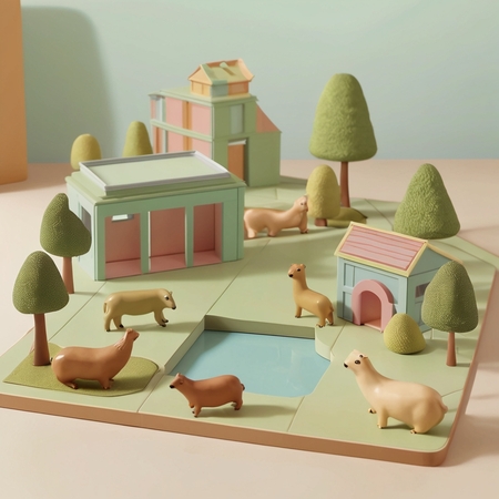 Игровые наборы сгенерированы в Leonardo с использованием в качестве референса изображения из оригинального проекта. Promt: a play set for kds with cute plastic animals and a building.
