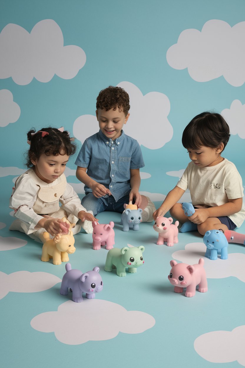 Постер создан в ideogram. Promt: a poster for a toy brand Capy on a pastel color. Kids playing with cute pastel animals.