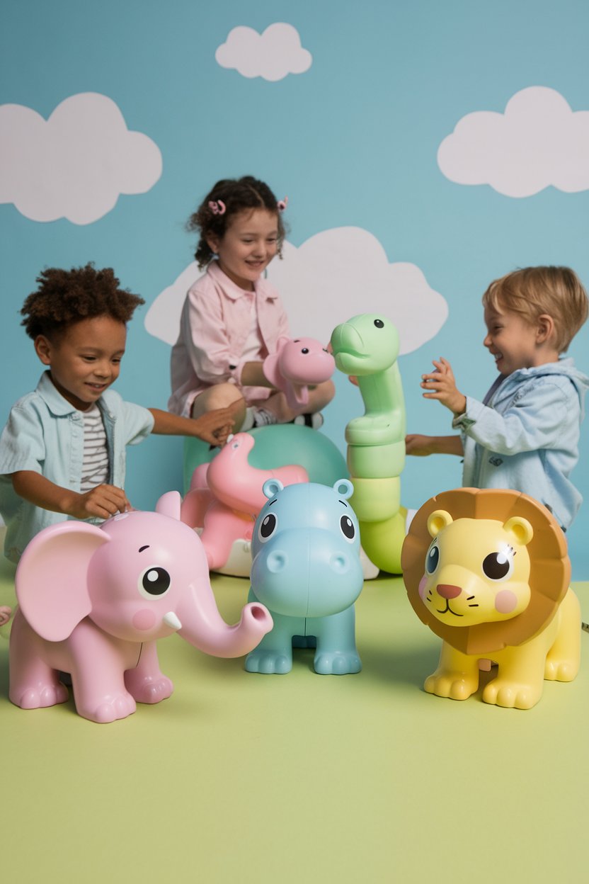 Плакаты сгенерированы в ideogram. Promt: a poster for a toy brand on a pastel color. Kids playing with small cute pastel animals.