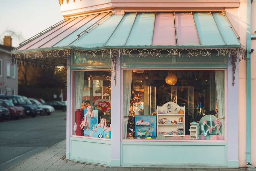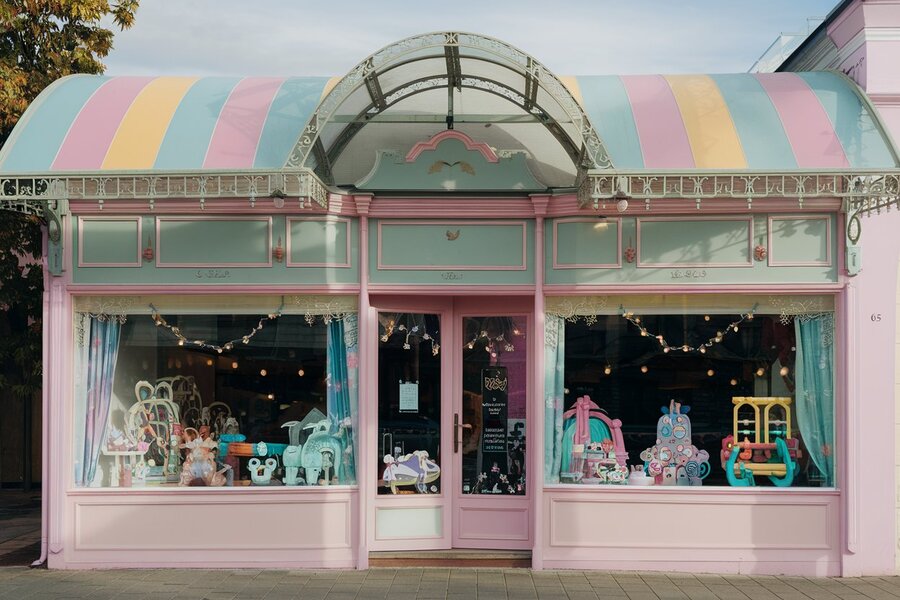 Сгенерировано в ideogram. Promt: toy store. A pastel-colored building, lit by the sun, with a beautiful canopy over the windows.