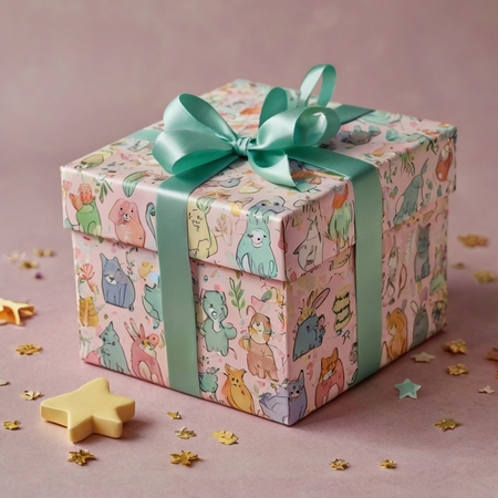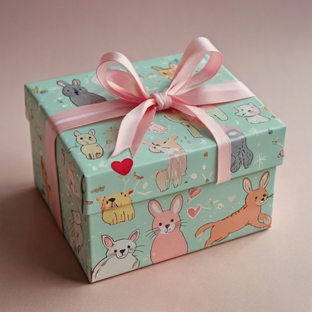Сгенерировано в Leonardo. Create an image of a beautifully wrapped gift box with a pattern of cute animals in pastel colors. The wrapping paper should feature playful, hand-drawn illustrations of animals such as bunnies, kittens, puppies, and bears, all in soft shades of pink, mint green, lavender, and pale yellow. The animals should be surrounded by whimsical elements like tiny hearts, stars, and flowers. The box is neatly wrapped, with smooth, crisp edges, and is tied with a matching pastel ribbon. The overall feel should be light, cheerful, and heartwarming, perfect for a special occasion or a children’s gift.
