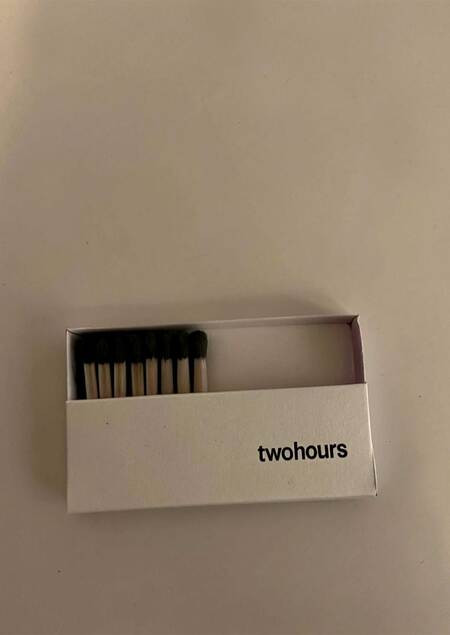 Generate a pack of matches for the TwoHours brand. The matches should be black, add minimalistic small TwoHours lettering in black color.