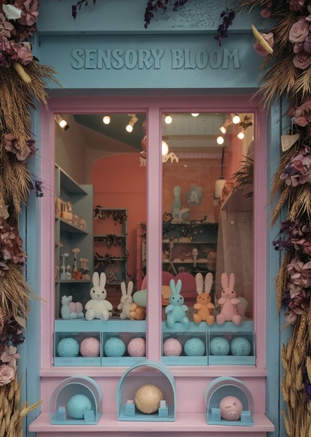 Ideogram.Ai/style: Realistic/ PROMPT: small store of sensory and soft toys in blue and pink colors. The store sells toys in the form of rabbits, aliens, bears. also in the store there are toys in the form of balls with different reliefs. above the store name sign «Sensory Bloom» written in Odin-Bold font. soft subdued lighting. toys in half transparent light blue packages are displayed in the windows. the store is decorated with dried flowers and wheat on the sides of the store. pastel colors.