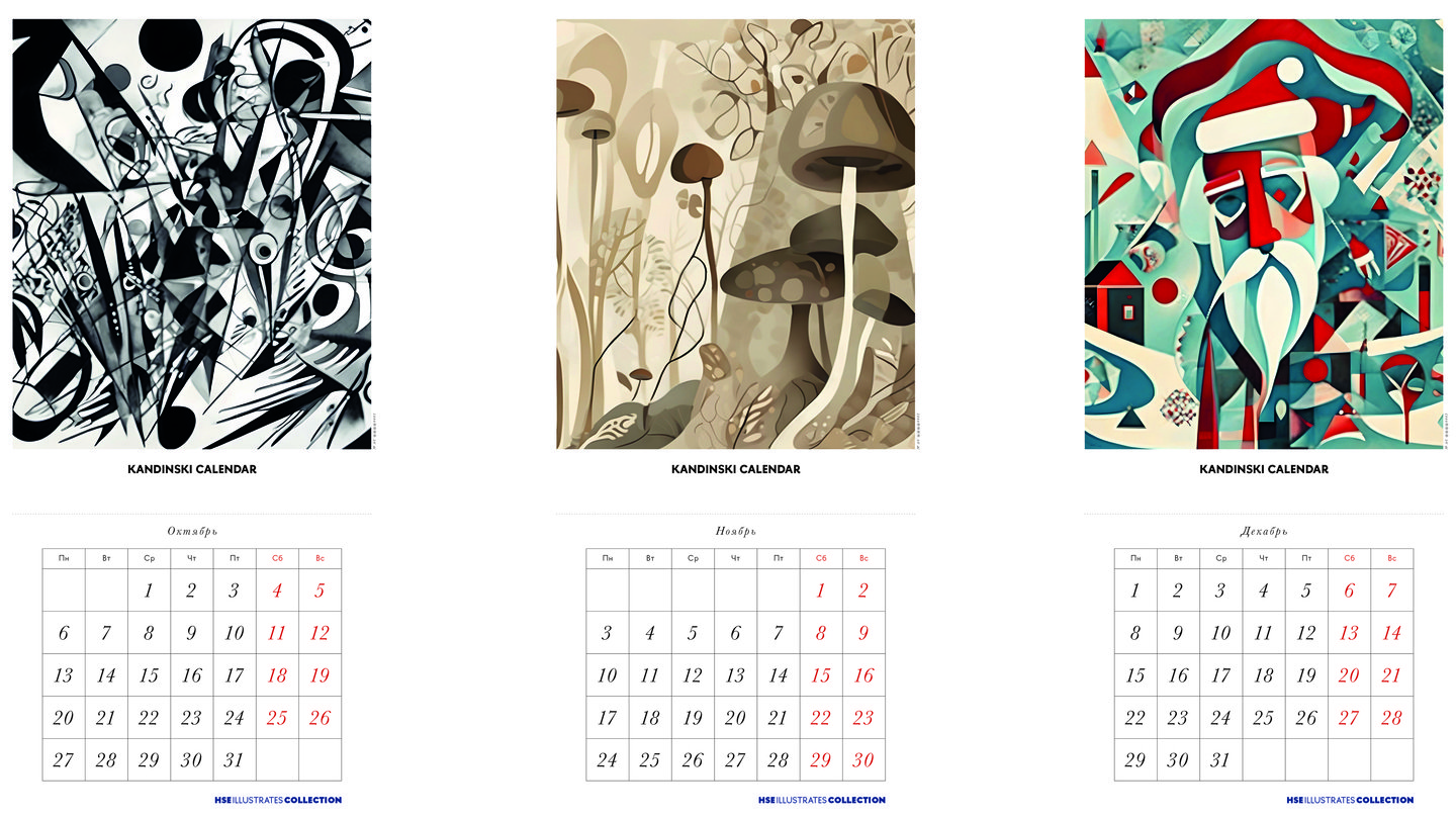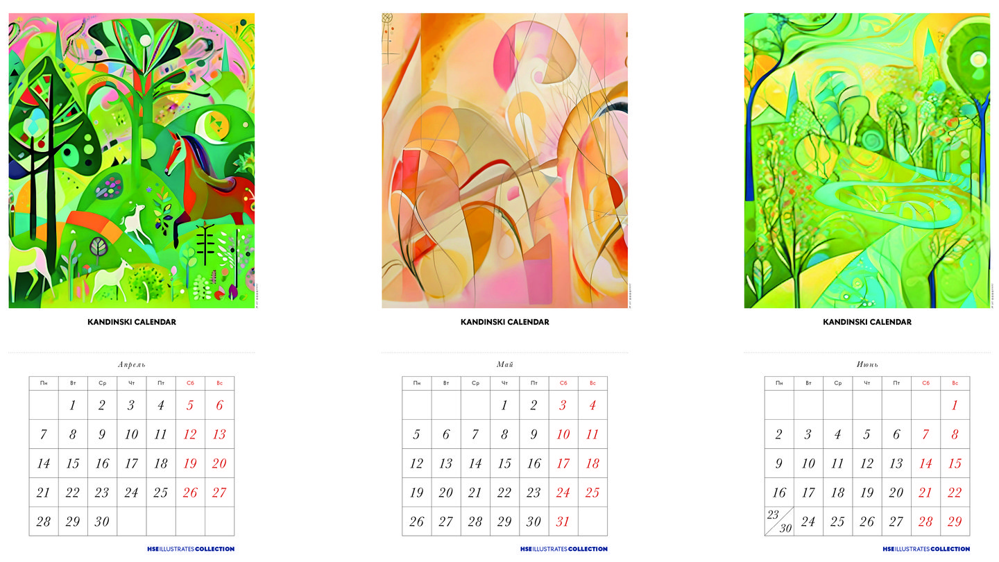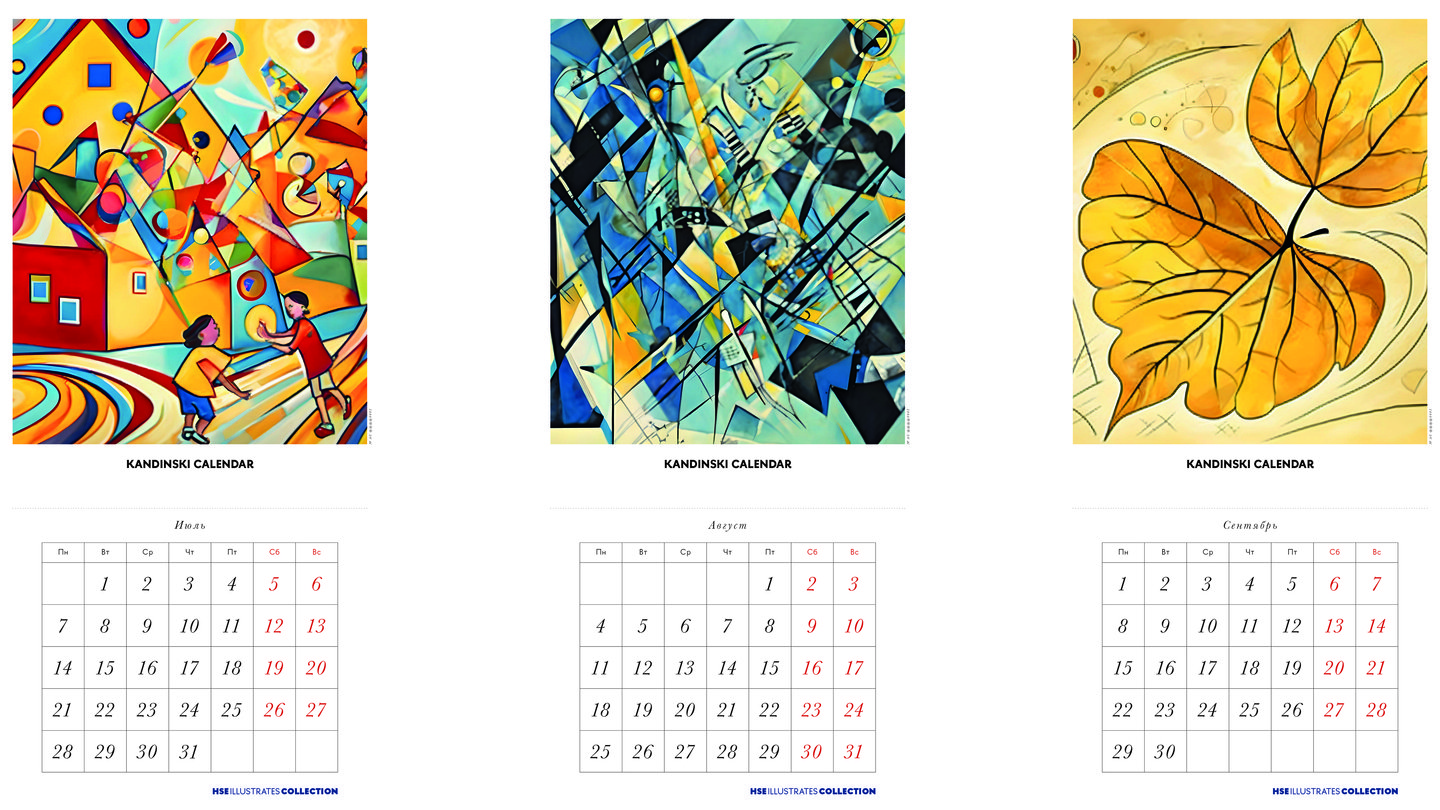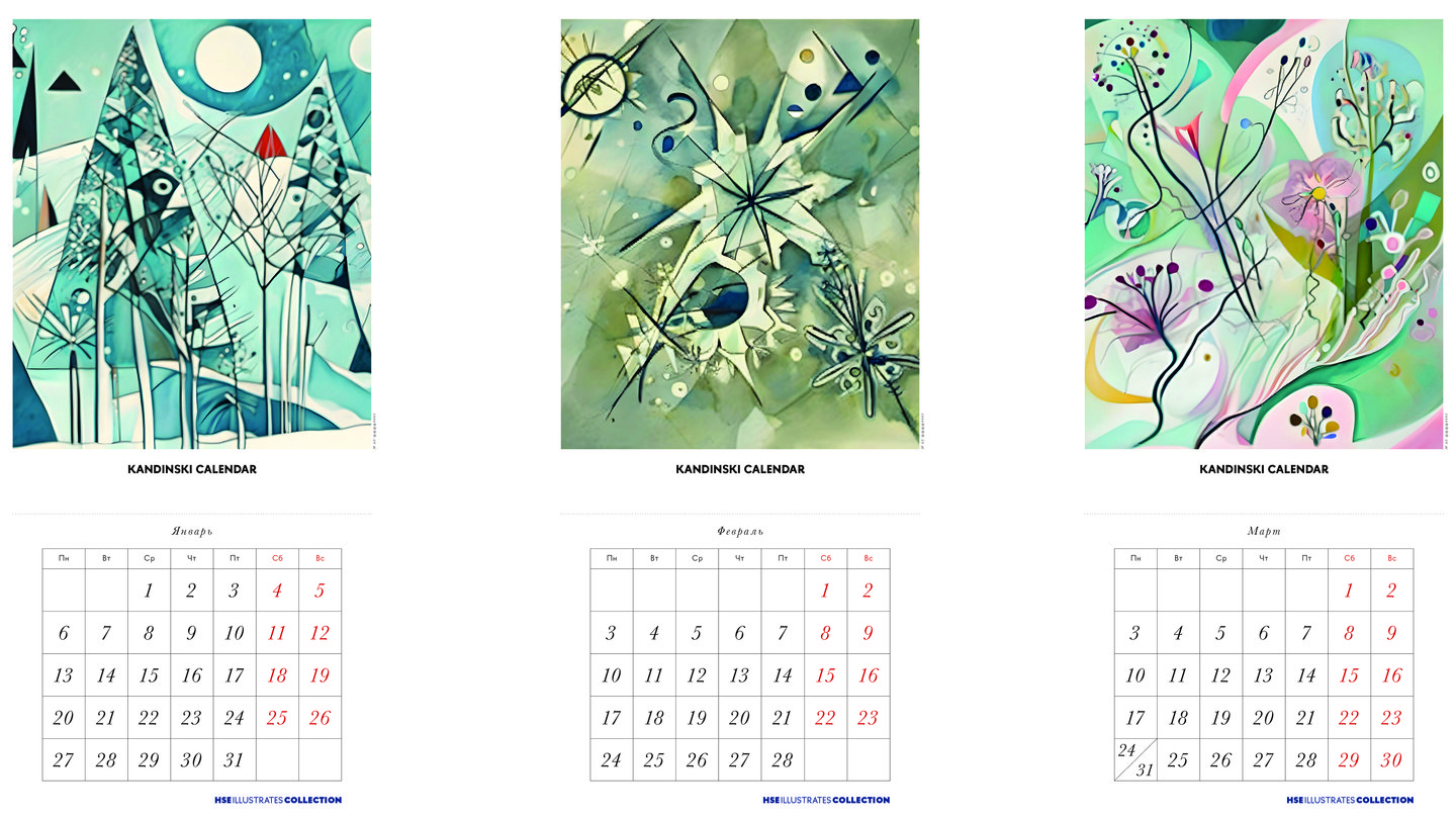Итоговая серий изображений — календарь, с индивидуальной генерацией на каждый месяц в стиле работ В. В. Кандинского. Изображения получились схожими на стиль художника, однако его работы мне кажутся более интересными, чем генерации ИИ. Возможно это связано с незаменимостью «человеческой руки» в исполнении картин.