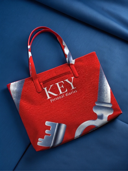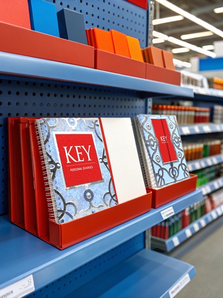 Сozy production mockup for «KEY» brand with logo on diaries and office supplies, bright red blue white black colors