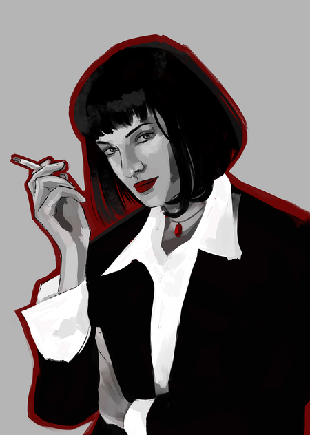Серия иллюстраций, посвящённая персонажам фильма Квентина Тарантино «Криминальное чтиво». Работы выполнены в монохромной гамме с акцентом в один цвет.