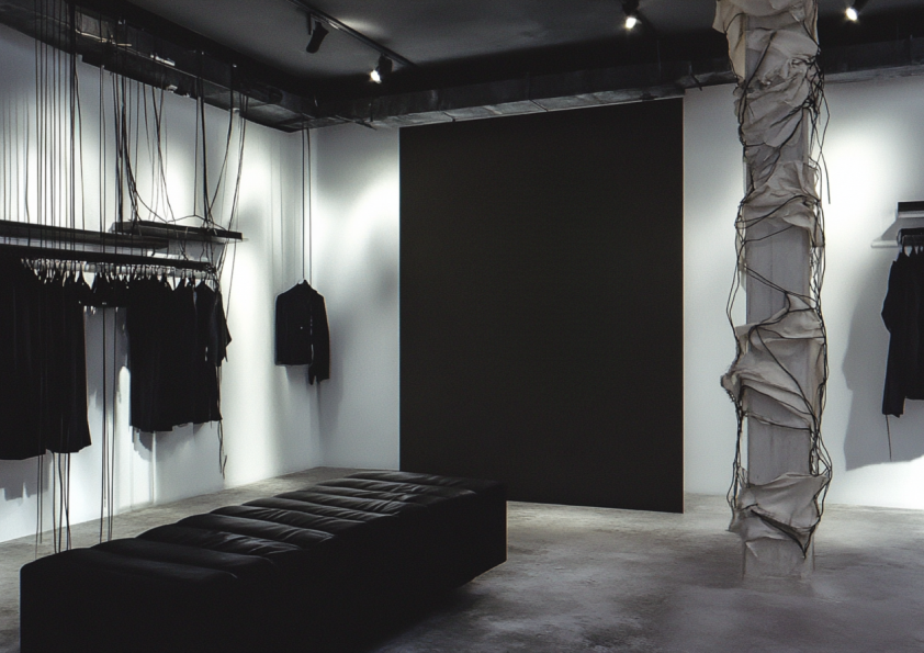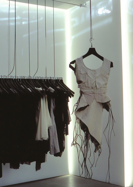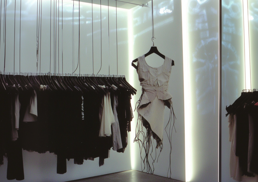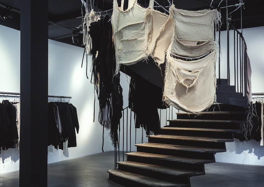 Промт: «fashion vhs photo of a facade of a fashion boutique with display windows through which mannequins with upcycled clothes are visible draped in different layers and typesof translucent fabric for Vogue editorial in the style of Maison Margiela with creative direction in the style of Enfants riches Deprimes. Various torn, worn fabric with protruding threads, almost transparency of the material. Mystical dark light from within. Ethereal glow, wierdcore, odd core, detailed objects, sharp details, grunge, in a hyper realistic photographic style, hard motion, motion blur, high resolution photography, frame in motion, hyper realistic photography, 8k resolution, inspiration is projection art and high fashion, in an urban environment with muted city elements in the background»