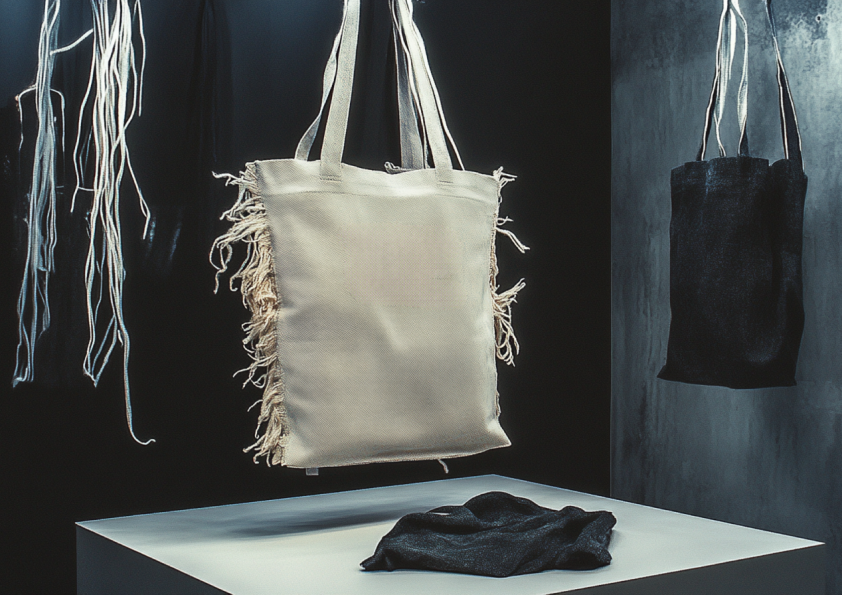Промт: «Fashion vhs photo of a minimalist fabric tag for Vogue editorial in the style of Maison Margiela with creative direction in the style of Enfants riches Deprimes, ribbed white cotton, minimalist fabric tag with. The tag should be a small piece of light-colored, natural fabric with slightly frayed edges for a vintage, upcycled look. A simple metal safety pin attaches the tag, adding to the artisanal aesthetic. Across the tag, in a clean Helvetica font, add the text: ’UPCYCLED CLOTHES’ Ethereal glow, wierdcore, odd core, detailed objects, sharp details, in a hyper realistic photographic style, hard motion, motion blur, high resolution photography, frame in motion, hyper realistic photography, 8k resolution, inspiration is projection art and high fashion, on black background»