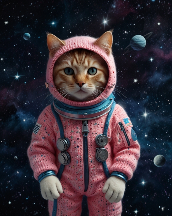 Промпт: knitted print dynamic picture with a cat in a spacesuit all around knitted knitted space and the cat like a real one in knitted space in weightlessness knitted stars in a spacesuit in pink and blue tones the cat is pink the universe blue the cat is completely visible he is in weightlessness knitted