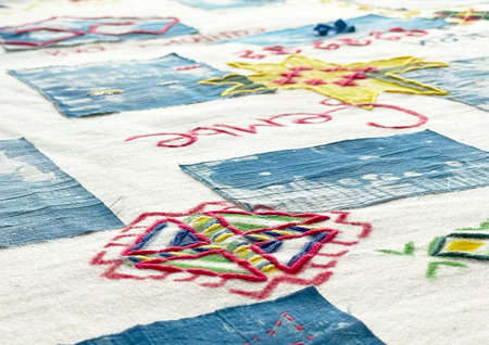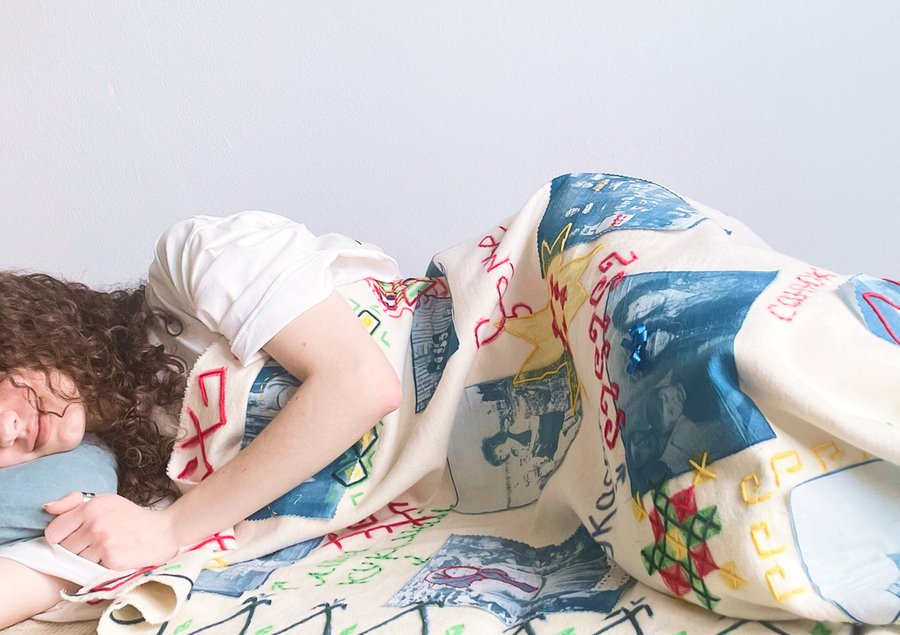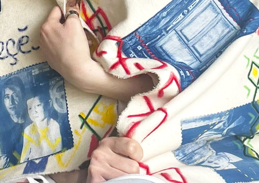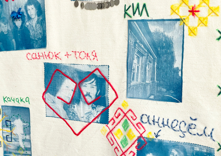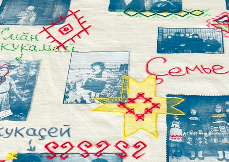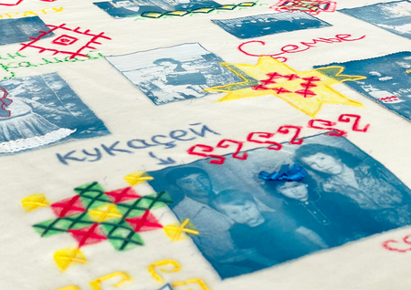 Проект представляет собой тканевое полотно, объединяющее архивные семейные фотографии и стилизованные чувашские узоры, выполненные вручную с помощью графики и вышивки.