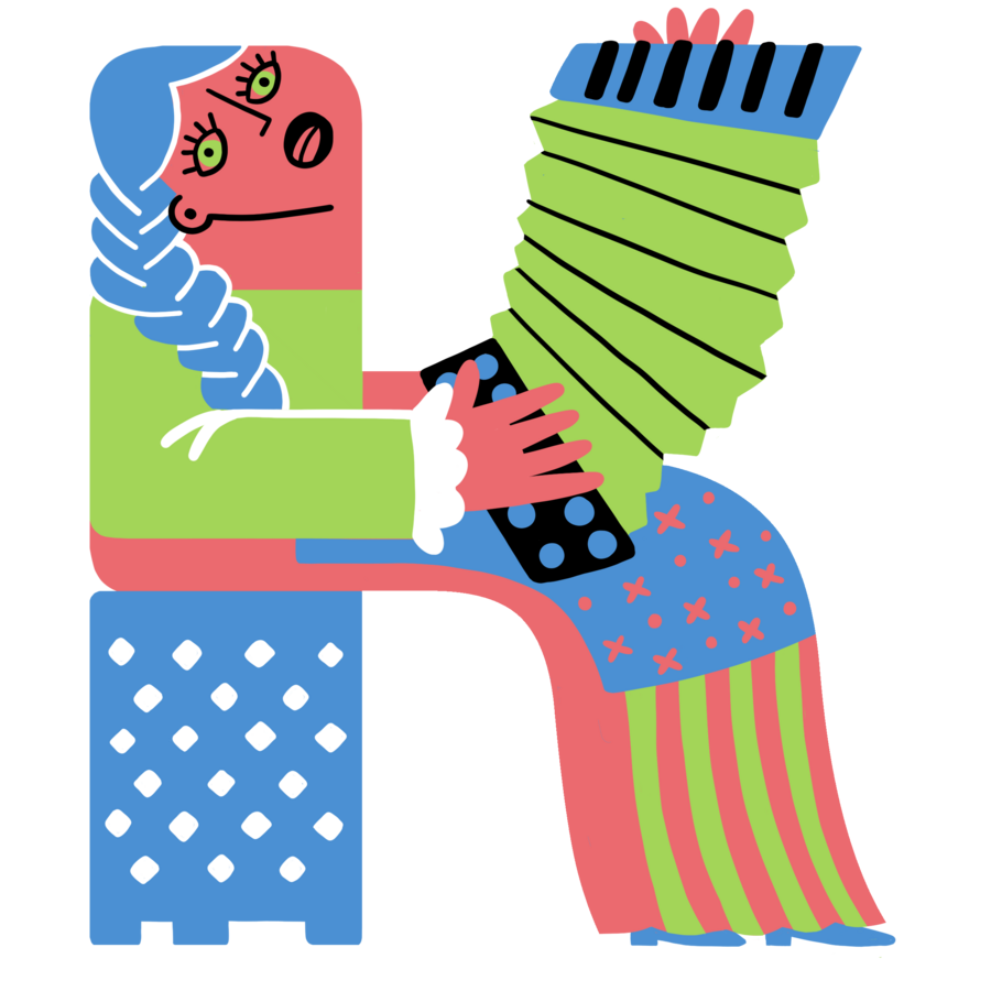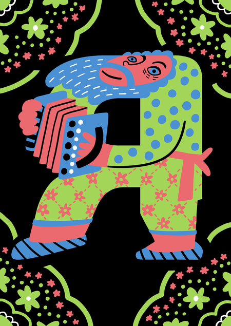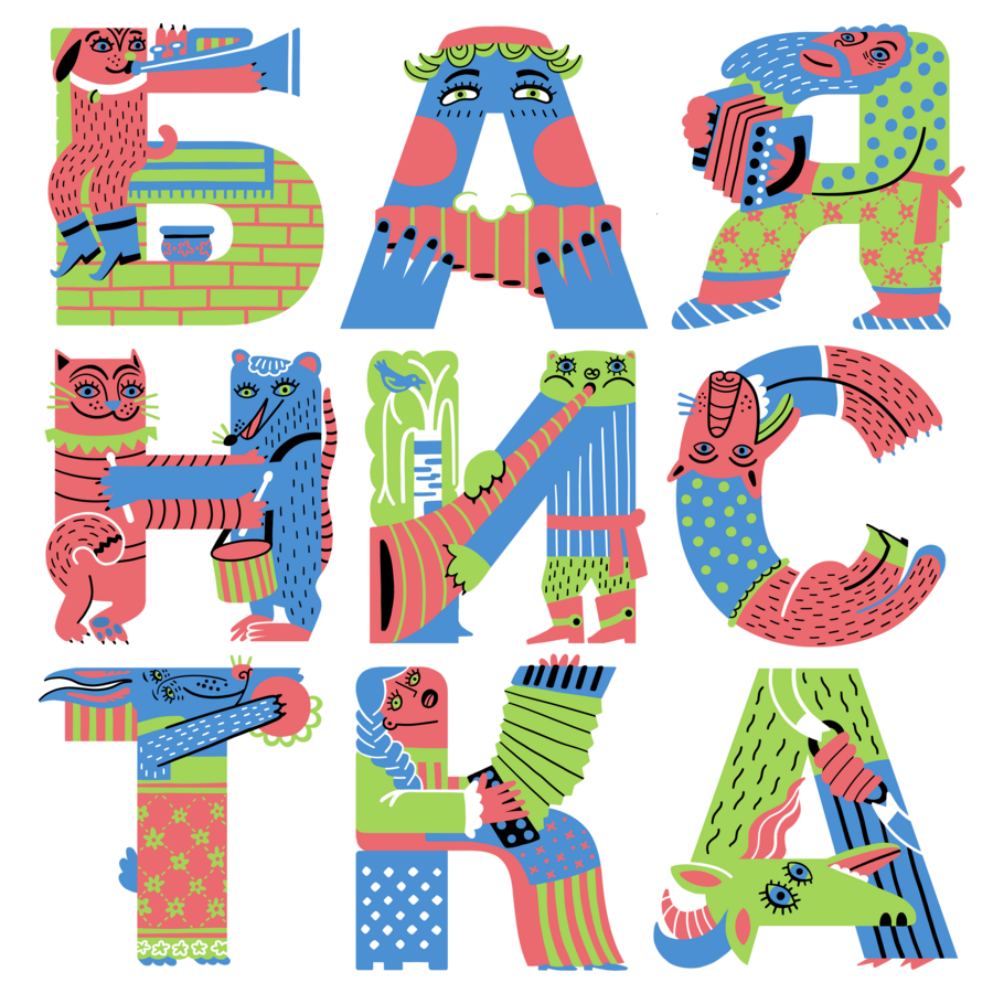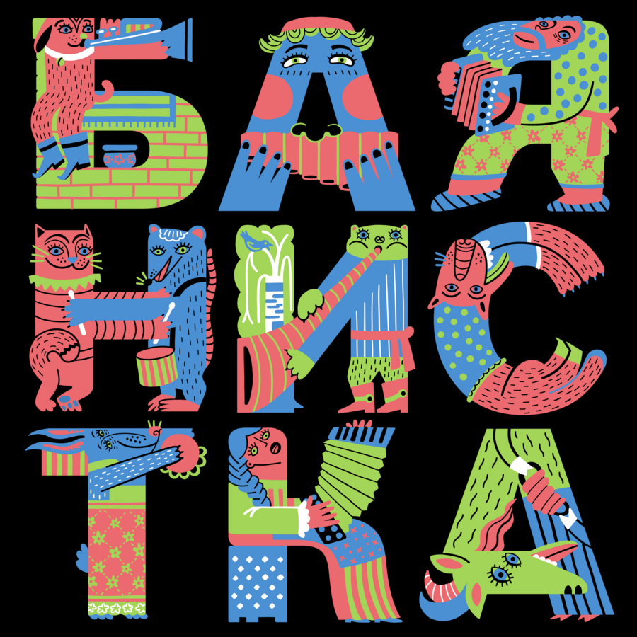 Буквицариум с отсылками к лубку. Баянистка — это образ мышления, яркость, непосредственность и подвижность, воплощённые в буквах. Быть баянисткой — значит не бояться глупо шутить, громко смеяться и нелепо танцевать.
