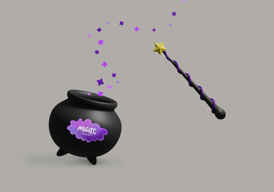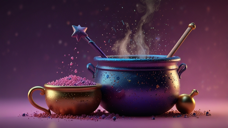 промпт: 3d octane render of cauldrons with bubbling effects and steam rising and a magic wand with a star on the bottom, showcasing the magical brewing process on pink and purple gradient background with sparkles for «Magic Sparks,» a brand specializing in children’s drink-making magic potions. The designs should be colorful, playful, and imaginative, appealing to a young audience. Results should contain pink, purple, blue and gold colours