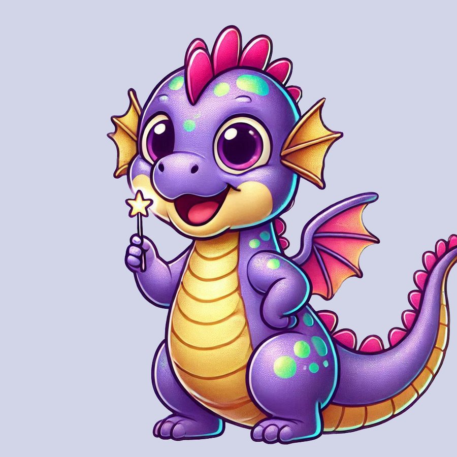 И вставила получившийся промпт в Microsoft Bing: Create a mascot for 'Magic Sparks, ' a brand specializing in children’s drink-making magic potions. The mascot is Fizz the Dragon: Fizz is a small, friendly dragon with iridescent scales that shimmer in the light. He has big, expressive eyes and tiny wings that flutter excitedly when he’s happy. Illustrations should incorporate bright magic colors like purple, gold and pink.