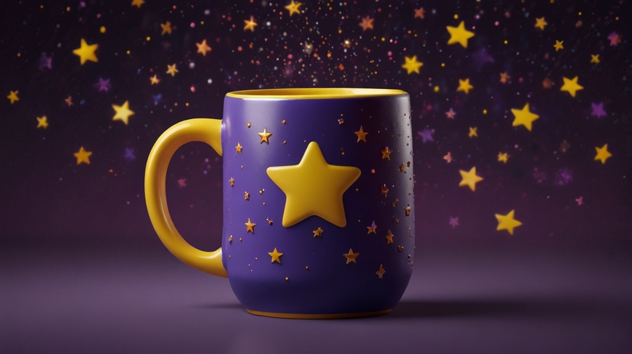 кружка промпт: A realistic studio photo of a purple mug with stars and yellow handle. The overall atmosphere of the image should be bright, colorful, magic, and imaginative, appealing to a young audience. Results should contain pink, purple, blue and gold colours. Background is a gradient