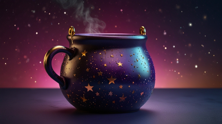 кружка-котелок промпт: A realistic studio photo of a cauldron shaped mug with stars and handle. The overall atmosphere of the image should be bright, colorful, magic, and imaginative, appealing to a young audience. Results should contain pink, purple, blue and gold colours. Background is a gradient