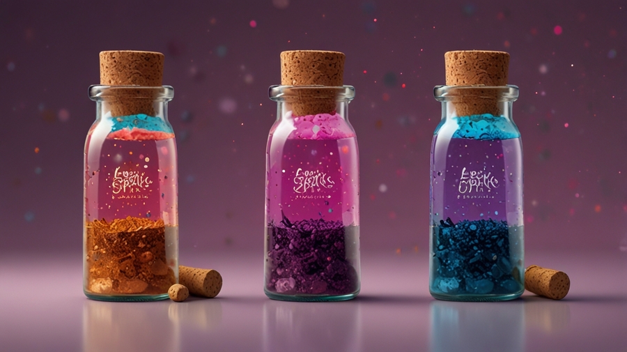 промпт: 3d octane render of flasks with unique, fantastical shapes (e.g., heart-shaped, star-shaped) and vibrant colors. Add whimsical details such as cork stoppers with tiny charms on pink and purple gradient background with sparkles for «Magic Sparks,» a brand specializing in children’s drink-making magic potions. The designs should be colorful, playful, and imaginative, appealing to a young audience. Results should contain pink, purple, blue and gold colours