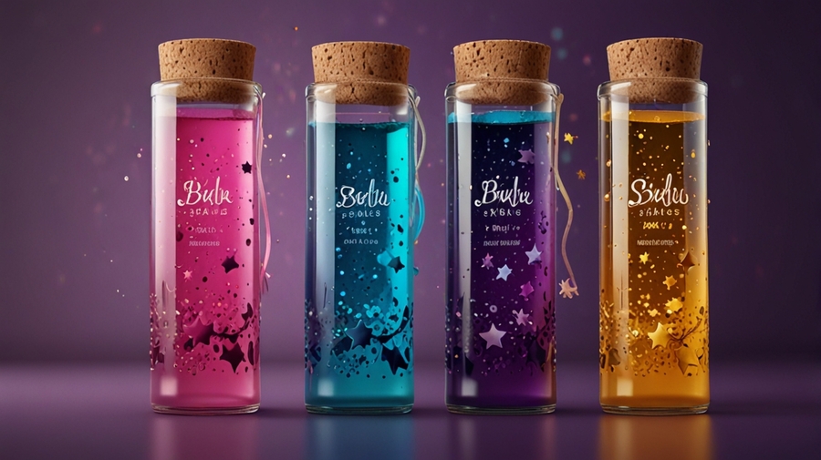 промпт: realistic studio photo test tubes closed with a cork lid in various sizes and shapes, with playful elements like stars, swirls, or sparkles embedded in the glass. Incorporate colorful liquid inside, with animated effects like bubbling or glowing on pink and purple gradient backgroun with sparkles for «Magic Sparks,» a brand specializing in children’s drink-making magic potions. The designs should be colorful, playful, and imaginative, appealing to a young audience Results should contain pink, purple, blue and gold colours