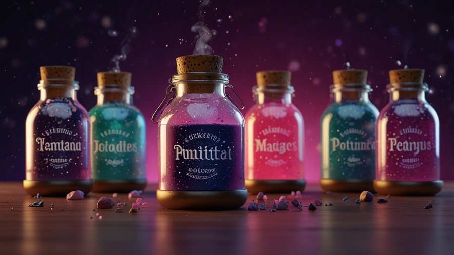 промпт для 1 изображения: 3d octane render of a selection of potion jars with intricate labels, featuring fun names of potions. Include cauldrons with bubbling effects and steam rising, showcasing the magical brewing process on pink and purple gradient background with sparkles for «Magic Sparks,» a brand specializing in children’s drink-making magic potions. The designs should be colorful, playful, and imaginative, appealing to a young audience. Results should contain pink, purple, blue and gold colours