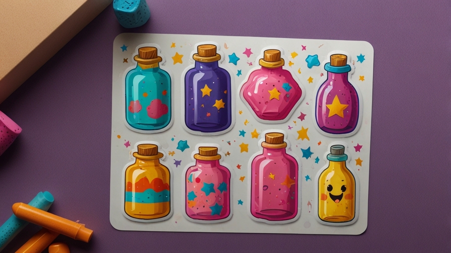промпт: a realistic photo mockup of sticker sheet lying on the table in the children’s room. Top view without perspective distortion. Stickers should contain cute potion bottle stickers in various shapes and sizes, each filled with colorful liquids. The designs should be colorful, playful, and imaginative, appealing to a young audience. Results should contain pink, purple, blue and gold colours.