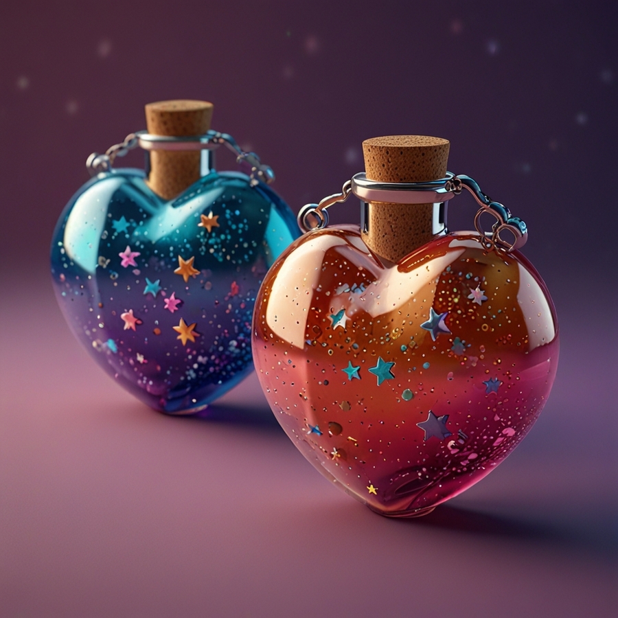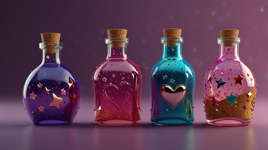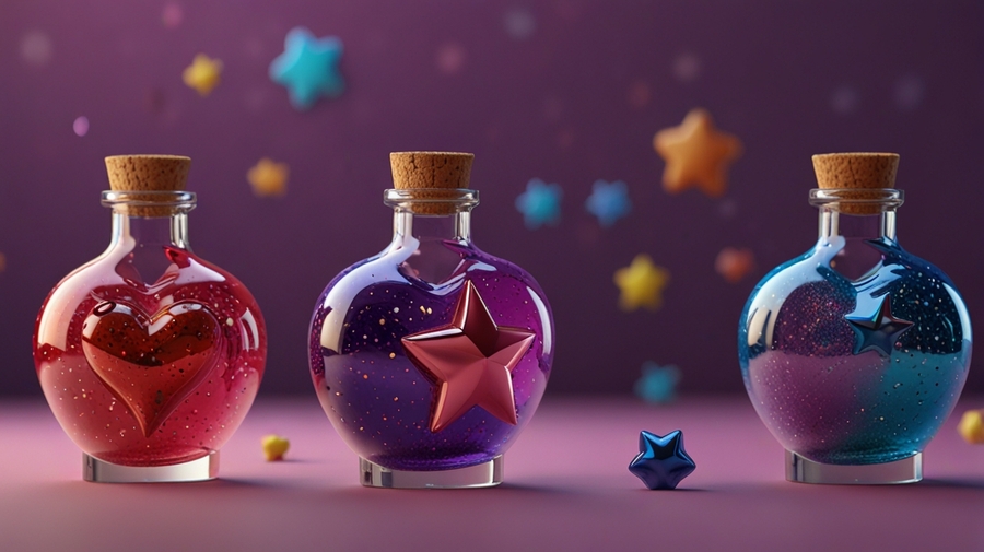 промпт для 2 изображения: 3d octane render of fantastical flasks in the form or shape of heart (soft edges), form of the star (soft edges) and other in vibrant colors. Add whimsical details such as cork stoppers with tiny charms on pink and purple gradient background with sparkles for «Magic Sparks,» a brand specializing in children’s drink-making magic potions. The designs should be colorful, playful, and imaginative, appealing to a young audience. Results should contain pink, purple, blue and gold colours