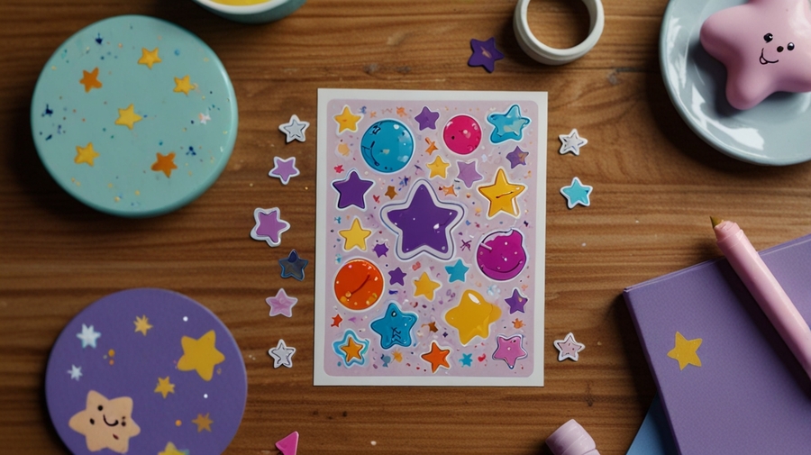 промпт: a realistic photo mockup of sticker sheet lying on the table in the children’s room. Top view without perspective distortion. Stickers should contain stars and cute potion bottle in various shapes and sizes, each filled with colorful liquids. The designs should be colorful, playful, and imaginative, appealing to a young audience. Results should contain pink, purple, blue and gold colours.